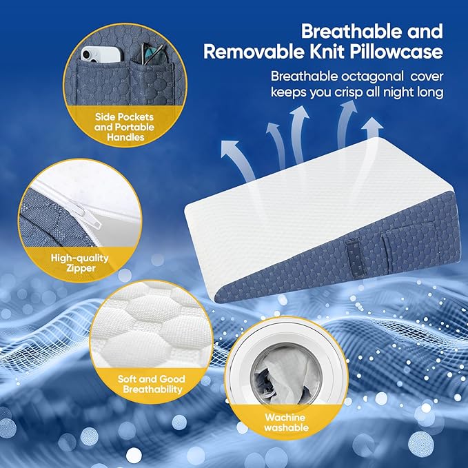 - Machine Washable Knit Pillowcase: Our triangle bed wedge pillow comes with a hotel-grade air-layered knit fabric pillowcase that is not only soft and breathable but also easy to remove and machine washable. With a convenient side zipper design, maintaining cleanliness and freshness is a breeze. The non-slip PVC particles on the bottom ensure that the foam wedge pillow stays in place, providing unparalleled comfort.
