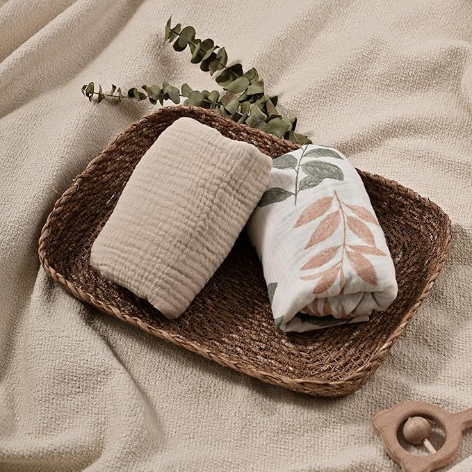 Muslin Bassinet Fitted Sheets, 2 Pack for Baby Boy and Girl, Soft Breathable Baby Pad/Mattress Sheet, Fit for Hourglass Oval and Rectangle Bassinet Mattress (Bright Leaves, Bassinet Sheets 2 Pack)