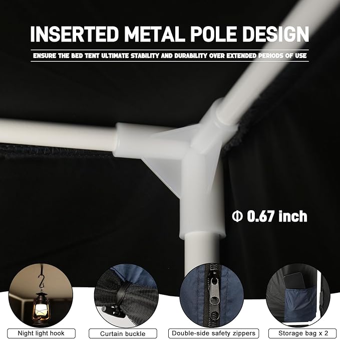 - ☑Multifunctional Design: There are 2 storage pockets inside the bed tent to place items. 2 zipper opening to place the charging cable, and 1 night light hook. Reflective zipper pulls allow you to quickly find the zipper door in the dark.