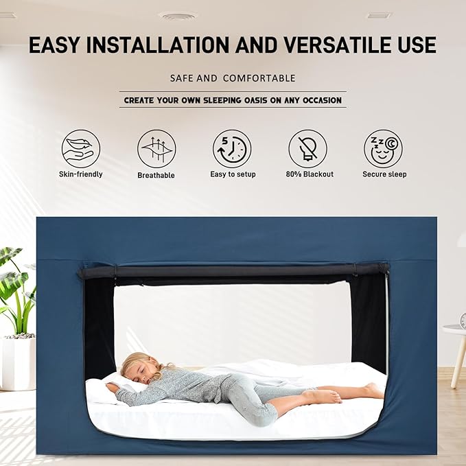 - ☑Cozy Sleeping Space: This full bed tent measures 75 x 39 x 54 inches, made of breathable and soft polyester fabric. The dark black fabric can reduce most of the light and is great for bedrooms, dorm rooms, or those who have trouble sleeping in bright environments, creating a cozy space to sleep in.
