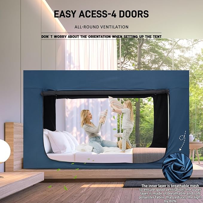 - ☑Easy Acess-4 Doors: This bed tent has 4 spacious large doors with double zippers that can be opened or closed inside and outside, making it easy for you to get in and out and don't worry about the orientation when setting up the tent. Each door has two layers of panels: the first layer is breathable mesh to ensure good ventilation; the second layer is black sponge fabric that reduces the light by 80%, you can choose the right light according to your needs, create your own sleeping oasis.