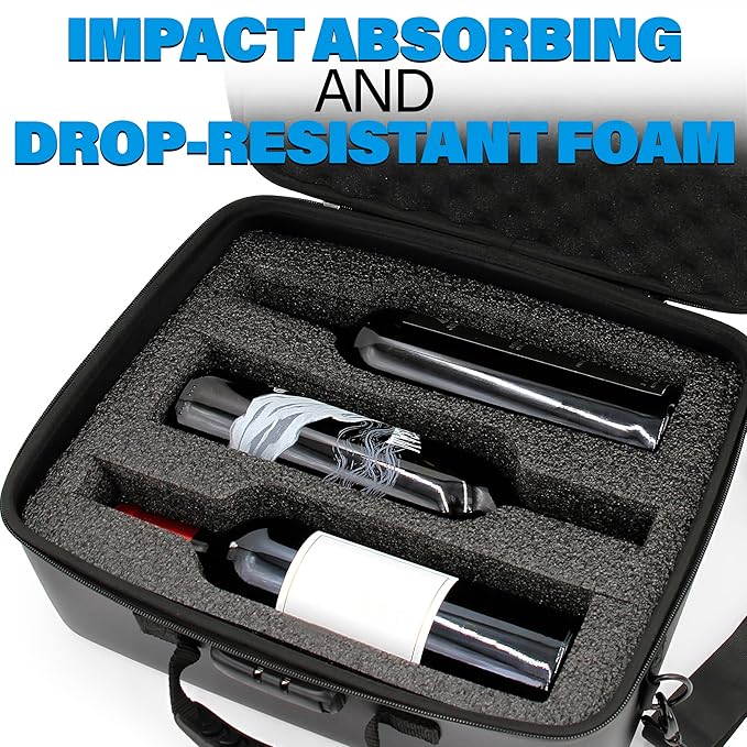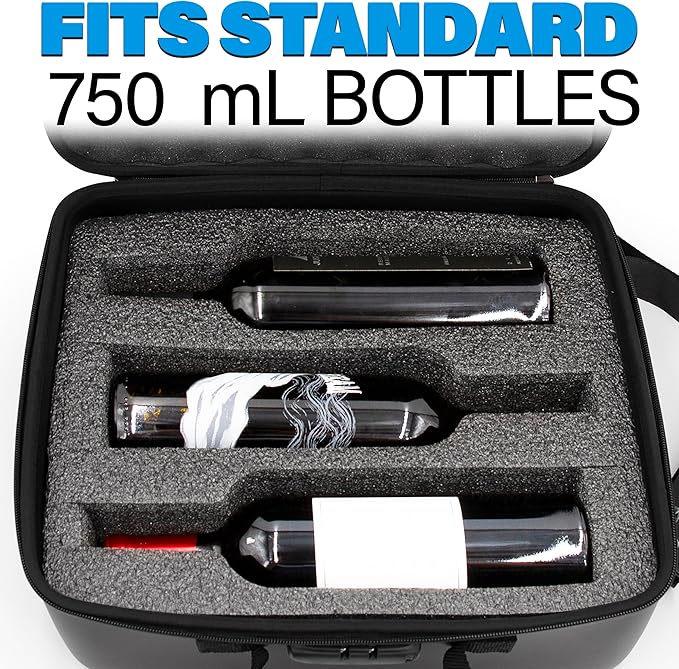 - [SHOCK-ABSORBING FOAM INTERIOR]: Our solution to wine luggage for travel includes a shock-absorbing polyethylene foam tray with 3 pre-cut slots for 750mL wine bottles. Each slot includes removable spacers to fit slightly longer than average bottles.