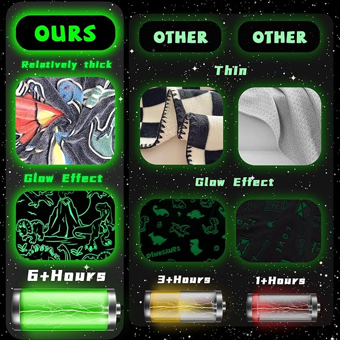 - GLOW IN THE DARK BLANKET- AS 1 2 3 4 5 6 7 8 9 10 11 12 year old boys gifts ideas, our glow in the dark dinosaur blanket for boys is welcomed by all ages of children. Our dino blanket for boys is designed to be glow in the dark blanket for boys girls kids. Just expose this kids' blankets & throws to bright light sources or sunlight for about 15 to 20 minutes, then the light up blanket will appear. Our luminous blanket will make the child feel safe and fun, and the gentle light will not affect their sleep.