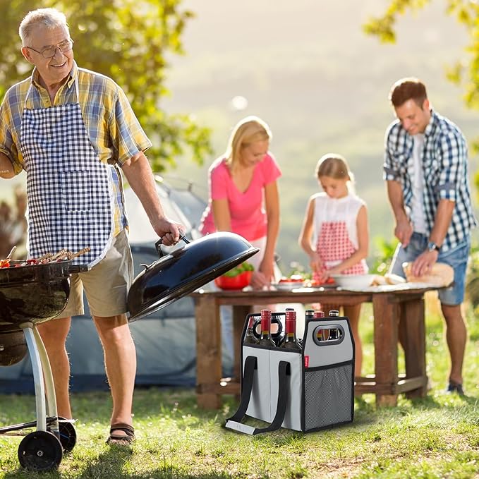 • MULTI-FUNCTIONAL BOTTLE CARRIER:The inside padded divider keeps 6 bottles of wine separate and prevent them from crashing with each other,You can use this as a bottle holder for wine, beer or other liquor, water, juice or soft drinks bottles, mason jars, soda cans, and more,Make grocery trips easy with separate compartments for drinks and food, secure your supplies