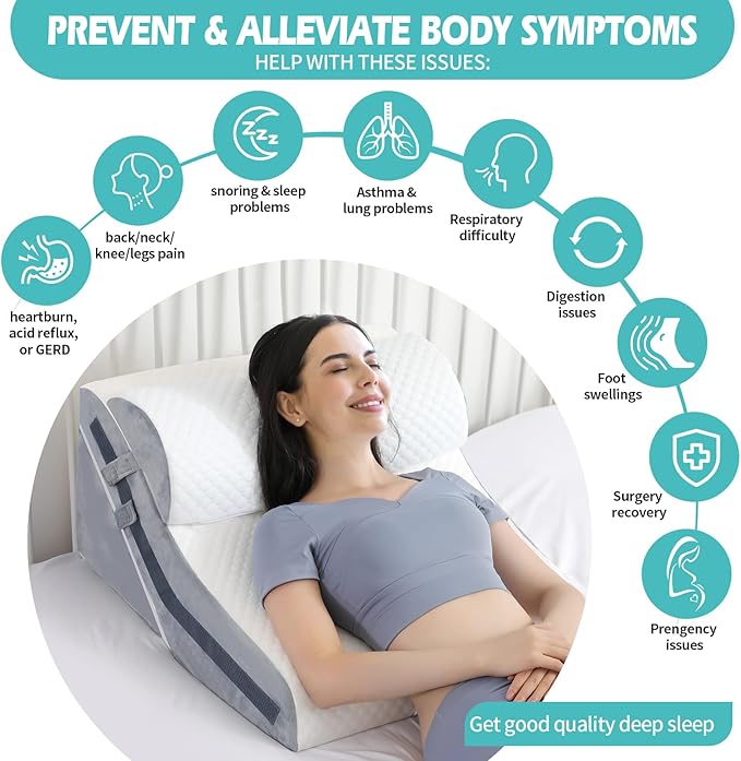- Ergonomic Orthopedic Bed Pillow Wedge Cushion: 3-piece bed wedge pillows set have a professional curve cushion design fit all people needs, orthopedic for after surgery, help elevate and support head, neck, back, waist, legs, foot, and overall health. Wedge pillow for snoring, reading, watching TV, checking mobile phone, working, help with acid reflux or heartburn, sleep apne, GERD, hiatal hernia, indigestion and stomach pain, nasal congestion, difficult breathing, postnasal drips, night-time cough, postoverative swelling, and high eye pressure