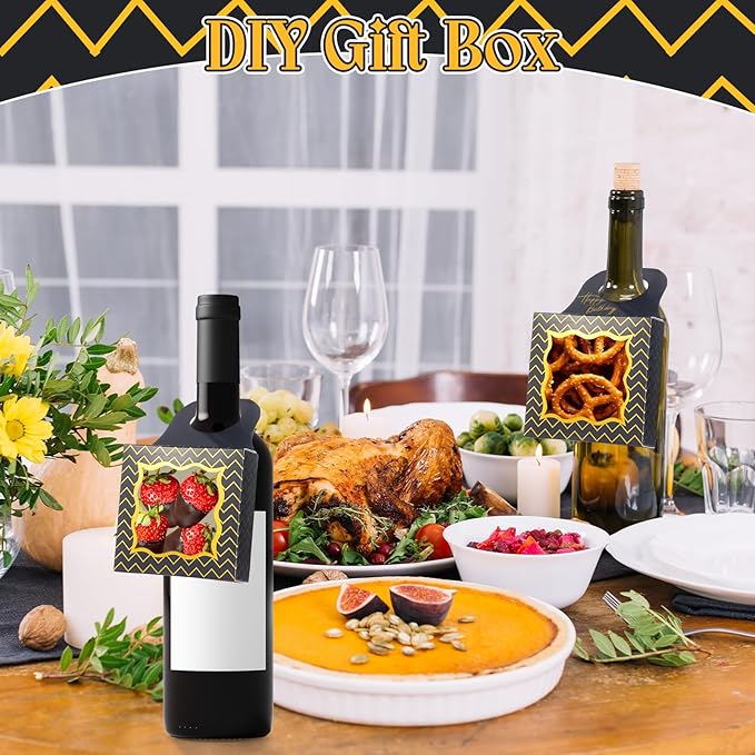 - UNIVERSAL SIZE - Wine bottle hanging boxes are 3.5 x 3.5 x 1.2 inches / 9 x 9 x 3 cm in size, and the hanging hole diameter is 1.5in / 3.8cm. Thick waterproof kraft paper material makes candy box durable and easily to hang on various size glass bottles such as champagne, prosecco, beers, and also plastic bottles like soda and water bottle.
