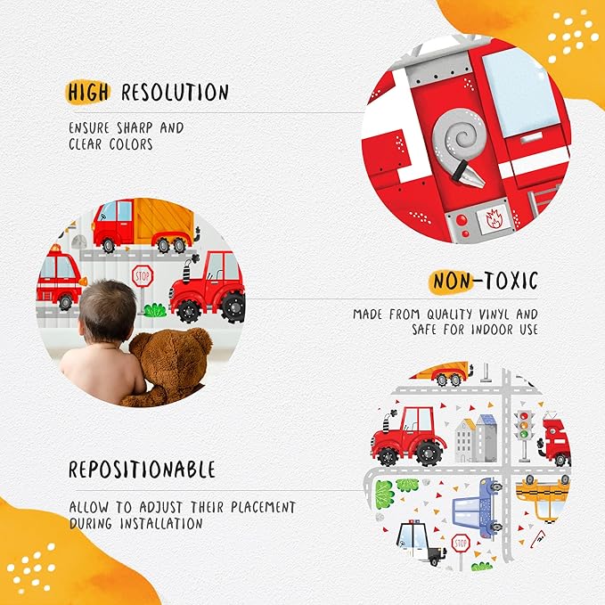 - 🦁 Nursery decor for kids rooms includes: car, police car, truck, excavator, fire truck, taxi, tractor, crane as well as houses, roads, signs and trees to instantly bring a boring wall to life. Item sizes range from 2" x 2" to 6.2" x 11", for a total of 58 items. Stickers come in an envelope in 5 sheets. Sheet size is 13.8" x 7.8".
