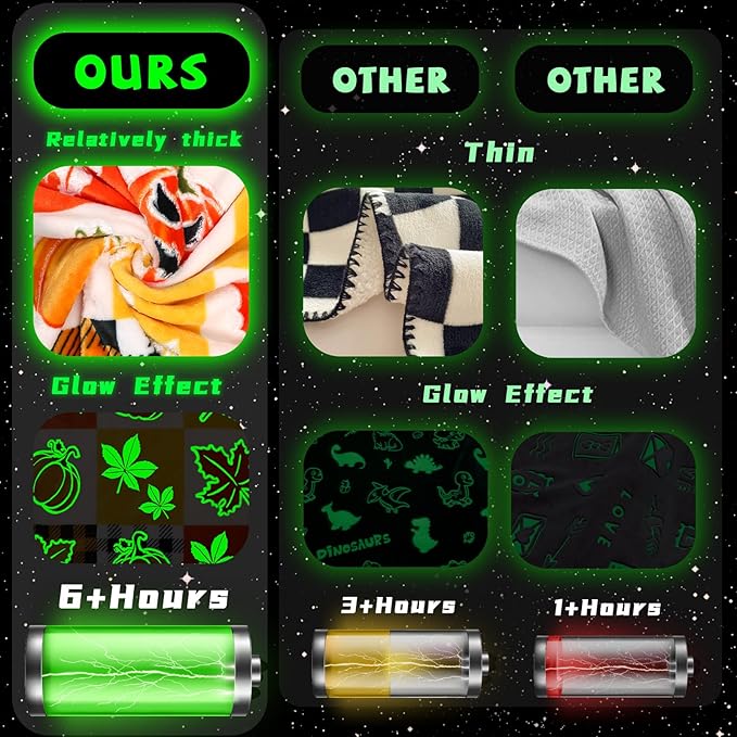 - Glow In The Dark Blanket: The cute fall blanket pumpkin feels very soft and can glow in the dark. Our Halloween pumpkin blanket can inspire fun for kids and are the guardian of the children at night. Just expose this fall throw blanket to a bright light source or sunlight for about 15 to 20 minutes before use, and this fall plaid throw blanket will glow in the dark. The stronger the light is, the brighter and longer it will glow.