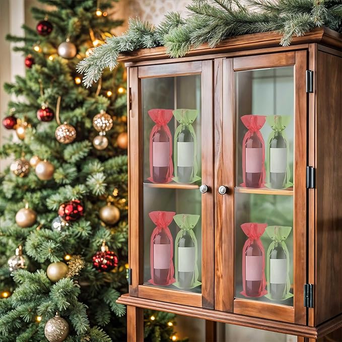 Megitzuu 20 Pieces Organza Wine Bags, 14.6 x 5.5 Inch Wine Gift Bag with Drawstring Sheer Mesh Wine Gift Pouches Bottle Covers for Halloween Christmas Wedding Party Favors (Red+Green)