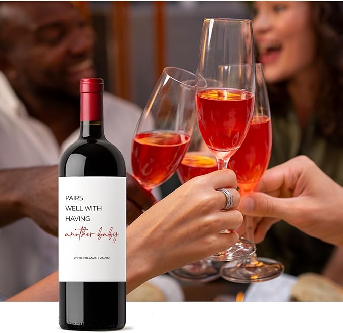 - 【Second Baby Announcement Wine Labels】Make pregnancy announcement more fun! Our second baby wine label says "Pairs Well With Having Another Baby", these unique wine labels are the perfect way to celebrate a new life is coming with funny sayings that everyone will love. Make memories last with these pregnancy announcement wine bottle stickers.
