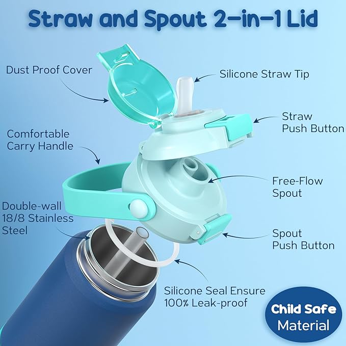 - 3-in-1 Lid & Kid-Friendly: Equipped with a dual-use & push-button lid for toddler cup, kids can sip through a silicone straw and enjoy a fast-flow chug by easily switch the two button, makes it easy for your child to use independently. Straw cup can prevent kids from choking or water pollution, direct chug cup help kids drinking quickly. If your kid is thirsty, just take off lid, drink freely from the wide mouth.The artful kids water bottle is an ideal choice for school and kid's outdoor sports!