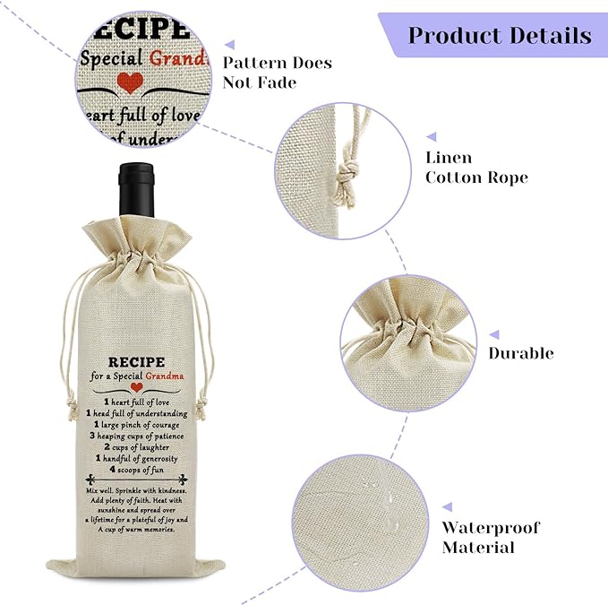 - Grandma Gifts from Grandchildren:Our wine bag is made of high-quality cotton linen material fabric, printed double-sided, smooth appearance, durable and reusable. At the same time, it has very good quality and safe enough to protect or hold wine or champagne bottle.