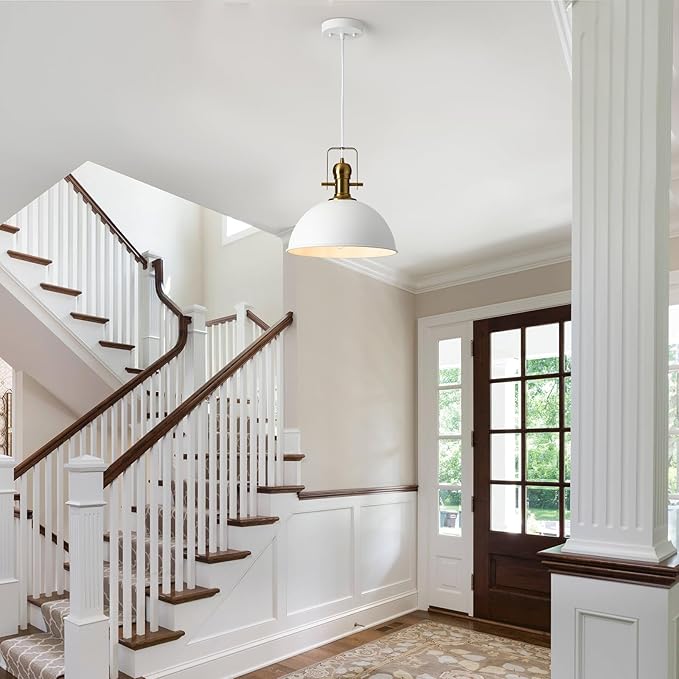- [Industrial & Vintage Design]: 3-Light industrial farmhouse pendant light fixtures with adjustable cord,white finish featuring retro-style dome shade, this antique pendant lighting is made of sturdy metal construction in black finish and inner gold finish.The vintage pendant lights is ideal for home, dining room, kitchen island, warehouse, entryway, corridor, restaurant, cafe, bar, club, barn, working bench.