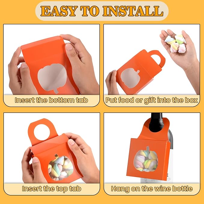 - Pumpkin Window - Halloween wine gift box has clear window, which allows you to see the all goodies inside, such as macaron, cookies, candy, treats, chocolate, and small fruits. Paper gift boxes designed with pumpkin pattern window, add fun to Halloween gifts.