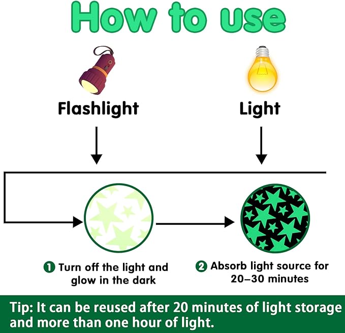 - Lasting Luminescence: Crafted from eco-friendly PET material, these glow stars for ceiling are durable and waterproof, preserving their glow over time. To achieve the best glow, expose them to a strong light for at least 15 minutes. The glow in dark stars can emit light for up to 4-6 hours in darkness, with the brightness and duration improving with longer charging periods.