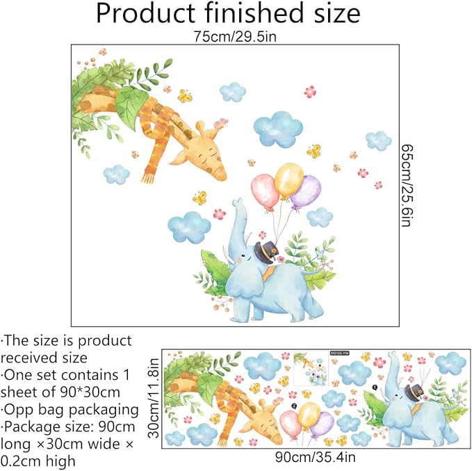 - Charming Animal Designs: Features a blue elephant with balloons and a brown giraffe, surrounded by whimsical clouds and flowers. Easy Peel & Stick Application: Convenient installation and removal process for hassle-free decorating. Optimal Flexibility: Comes as a single 90cm x 30cm sheet for custom placement. Compact Packaging: Includes an OPP bag and outer bag for easy storage and transport. Perfect for Any Room: Adds a playful touch to bedrooms, playrooms, or any space in need of a touch of magic.
