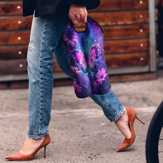 doginthehole Wine Bottle Travel Bag 2 Bottle Purple Butterfly Daisy Print Wine Carrying Tote for Women Wine Lover Champagne Carrier Bag Portable Neoprene Wine Tote for Travel, Picnic, Party