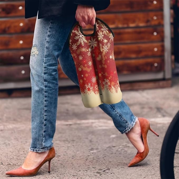 doginthehole Christmas Decorations Wine Carrier Tote Bag 2 Bottle Portable Neoprene Wine Tote Holders, Xmas Red Golden Snowflake Wine Carrying Case Bag for Wine/Beer/Champagne/Water/Drinks