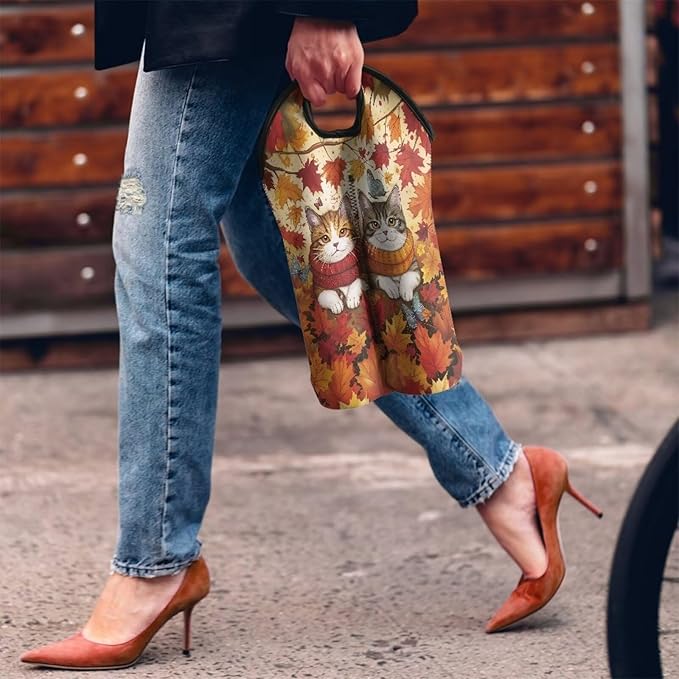 doginthehole Cute Cats Wine Bottle Holder 2 Bottle Wine Carrier Tote Bags Fall Maple Leaves Portable Champagne/Water Bottle/Beer Carriers Bag Case for Travel, Picnic, Party, Thanksgiving Day