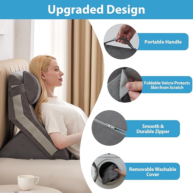 - 【Washable Cover & Portable Handle】Our 4pcs wedge pillow set features a breathable and skin-friendly knitted air layer fabric cover, promoting airflow for a cool sleep experience. The removable cover with a hidden zipper is machine washable for easy maintenance. Wide and foldable velcro sewn on the side allows for various customizable combinations. Designed for convenience, it includes a carry handle for portability, making it ideal for home use and travel.