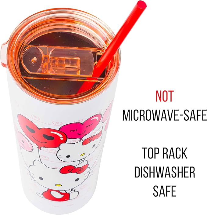 - Sanrio HELLO KITTY: This adorable Hello Kitty tumbler is designed with Ms Hello Kitty on a white background surrounded by adorable pink and red heart balloons.