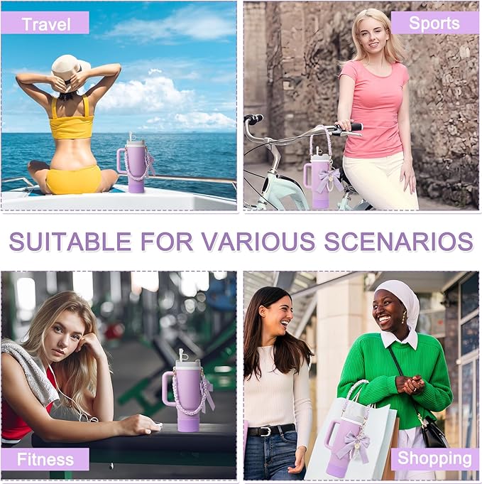 BELSITA Stanley Cup Accessories Set, Bow Pearl Chain Braided Design Water Bottle Handle Strap, Silicone Stanley Cup Boot, Stanley Charms for Stanley Cup 30/40oz Tumble (Purple)