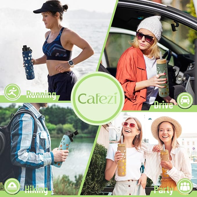 - 【TWO WAYS TO DRINK】Cafezi glass water bottle with sleeve come with two kinds lids ,The one bamboo lid with straw ,It is suitable for all kinds of cold drinks. Whether you're driving or at home or in the office,both are very good choices. The plastic spout lid with handle ,is 100% leak-proof more suitable for carrying around,the best partner for outdoor travel.